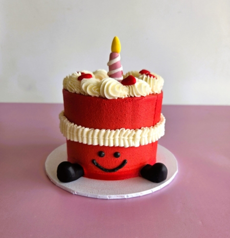 Decoration: Smooth red icing finished with delicate hand-piped detailing, a sweet character face, and adorable booties