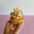 WHITE CHOC LATTE: Vanilla cake base + White choc latte ganache filling + Latte buttercream icing + Jimmy sprinkles