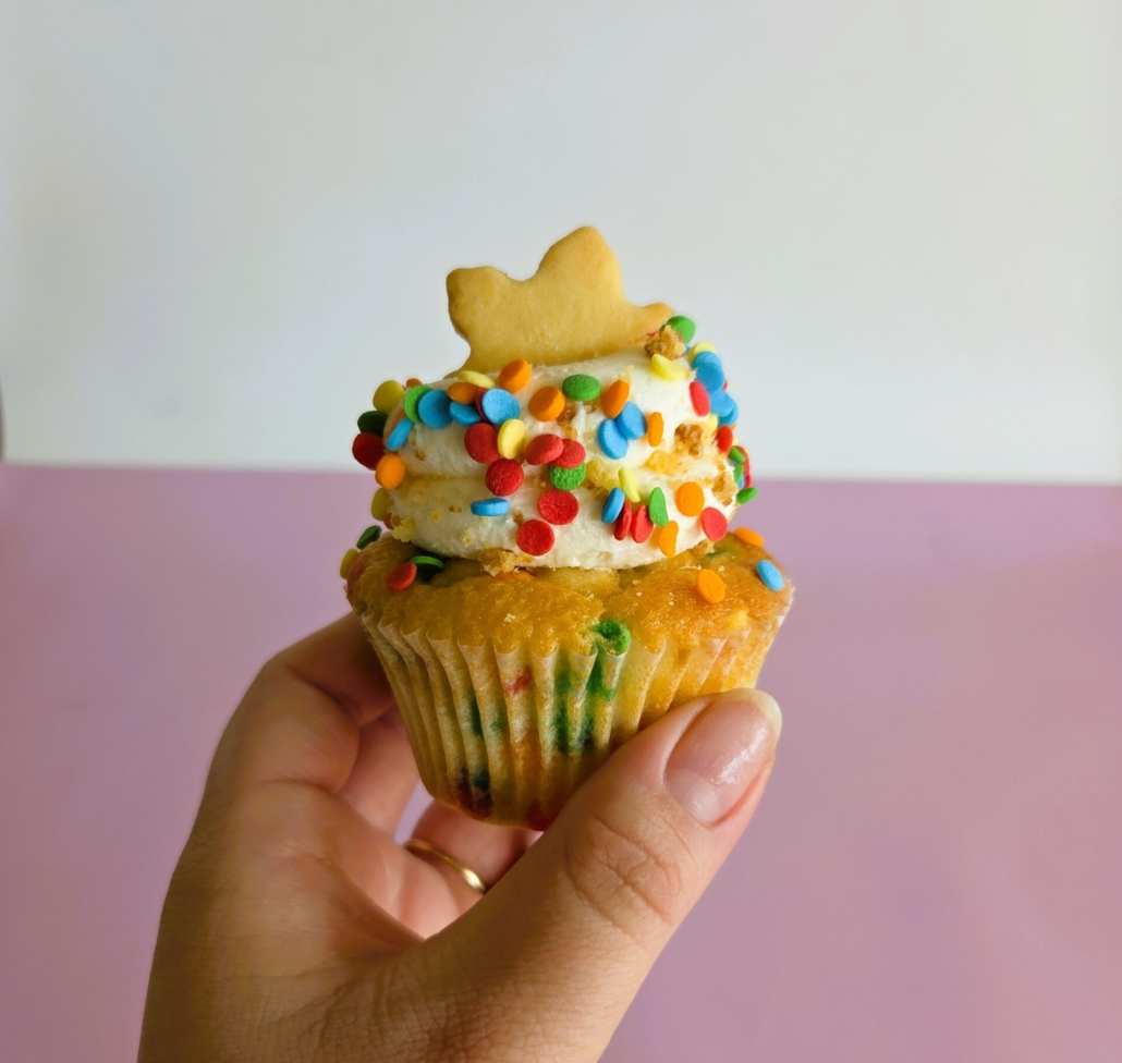 BIRTHDAY FUNFETTI: Vanilla cake base with baked in Rainbow Funfetti sprinkles + Vanilla buttercream icing + Rolled in Cake crumb + Shortbread cookie