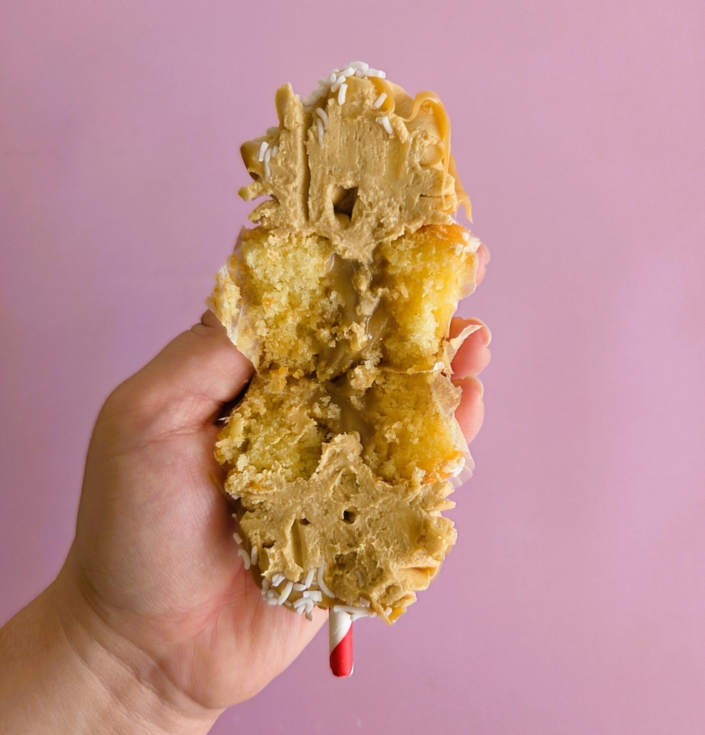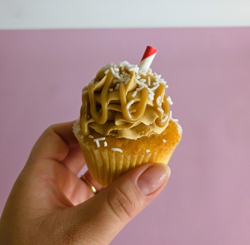 WHITE CHOC LATTE: Vanilla cake base + White choc latte ganache filling + Latte buttercream icing + Jimmy sprinkles