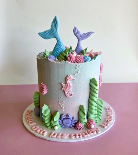 Decorations: 2 x Large Mermaid tails, Assorted seashells, Edible pearls, sprinkles & glitter, small icing/piping details