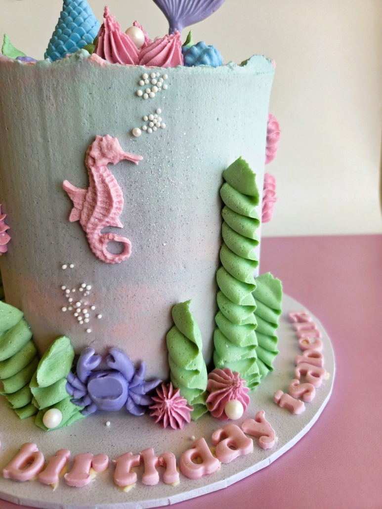 Decorations: 2 x Large Mermaid tails, Assorted seashells, Edible pearls, sprinkles & glitter, small icing/piping details