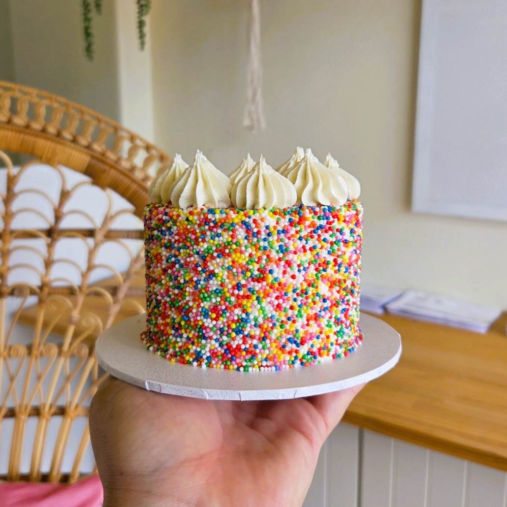 Decoration: A 100’s & 1000’s sprinkle covering & white piped rosettes