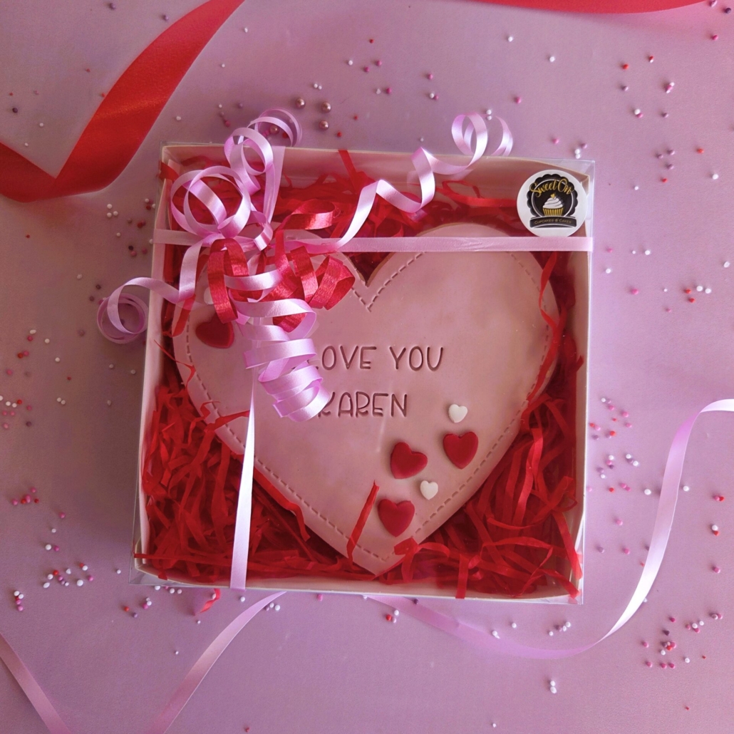 Decoration: Pink overlay with stitch detailing, finished with “I love you” and the option to add a personalised name.